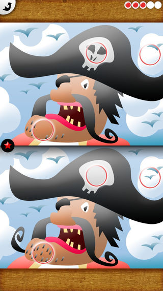 Gioco di attenzione e ricerca visiva in cui il bambino deve confrontare e trovare le differenze in coppie di immagini ambientate nel mondo dei pirati.